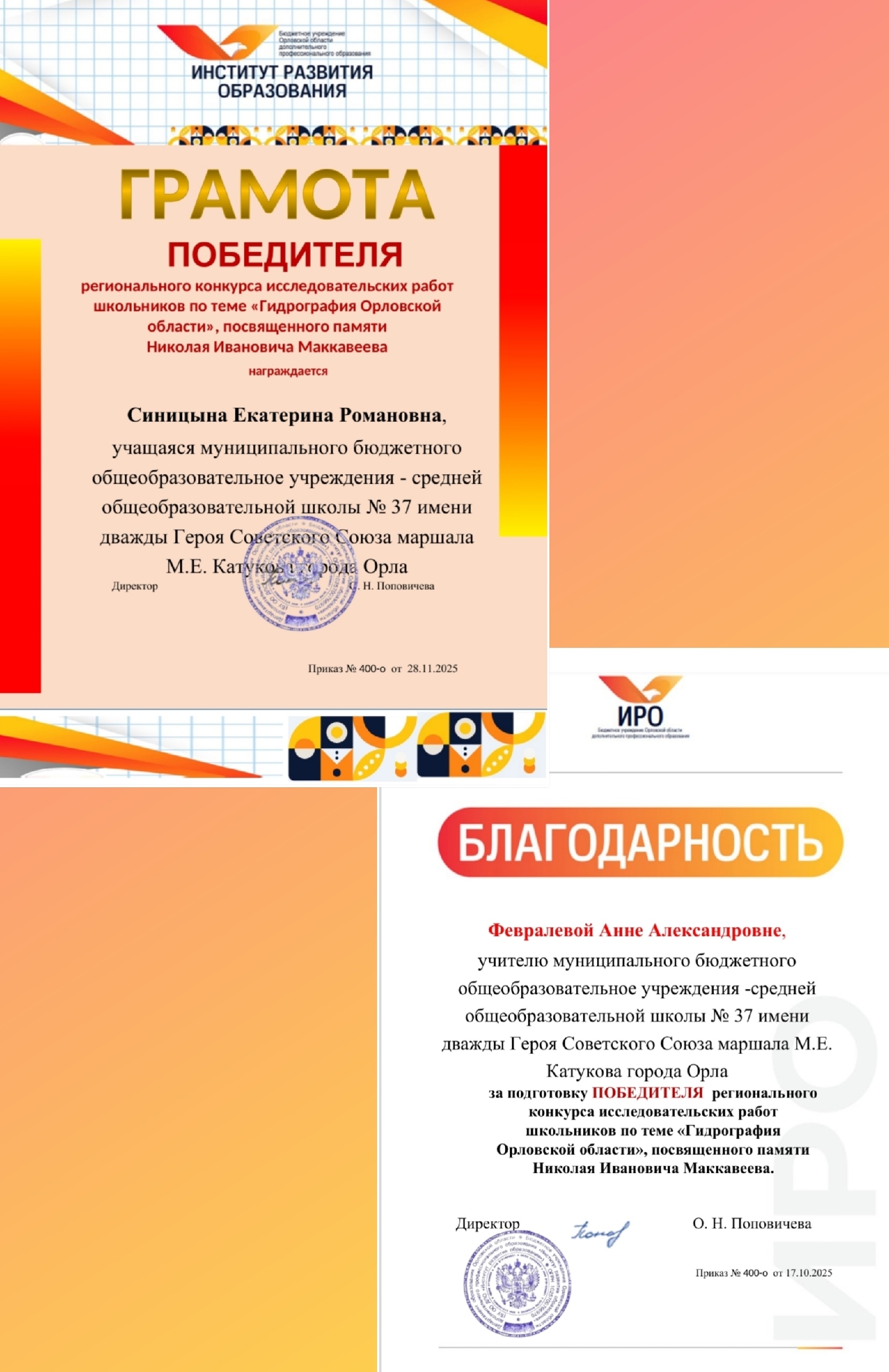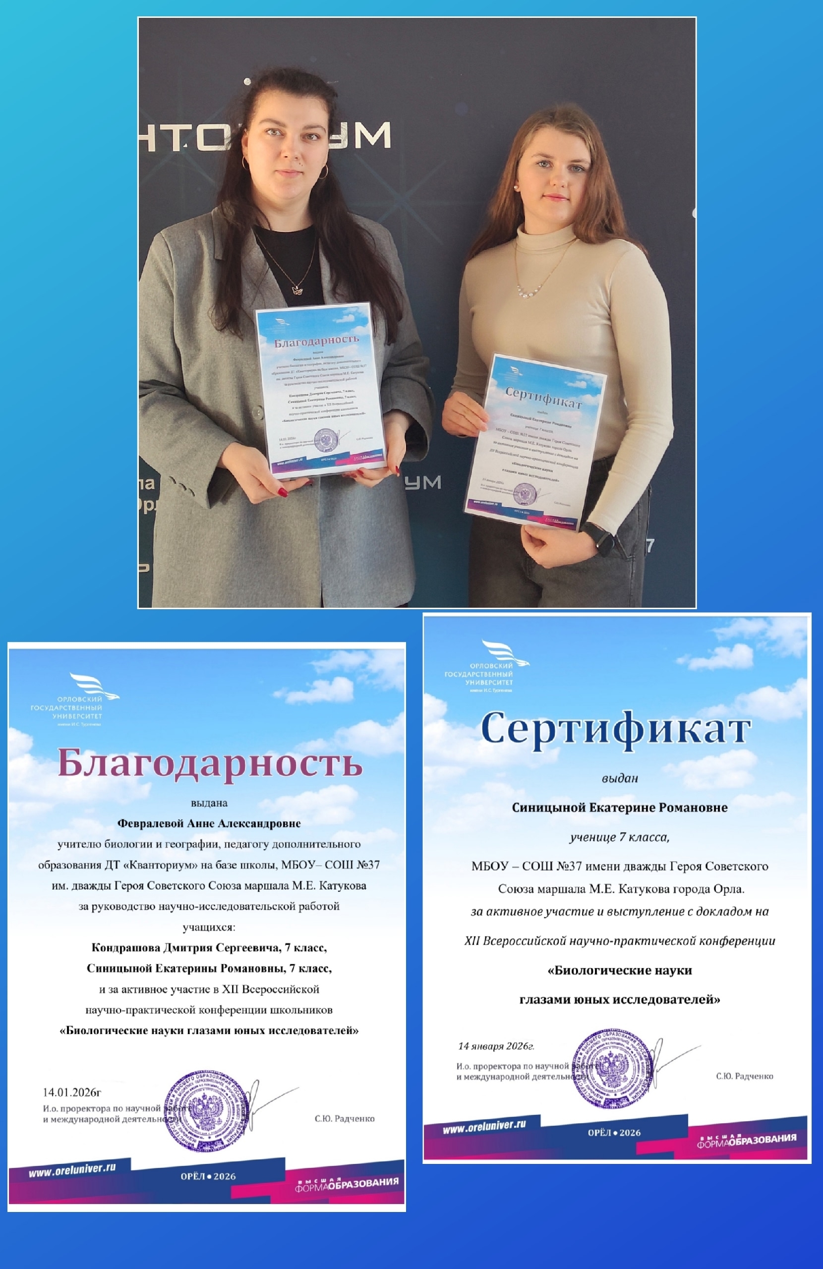 Поздравляем ученицу 7 "Д" класса Синицыну Екатерину, ставшую ПОБЕДИТЕЛЕМ Регионального конкурса исследовательских работ школьников "Гидрография Орловской области", посвященного памяти Николая Ивановича Маккавеева и ее руководителя - Февралеву Анну Александровну, педагога дополнительного образования и учителя биологии и географии.