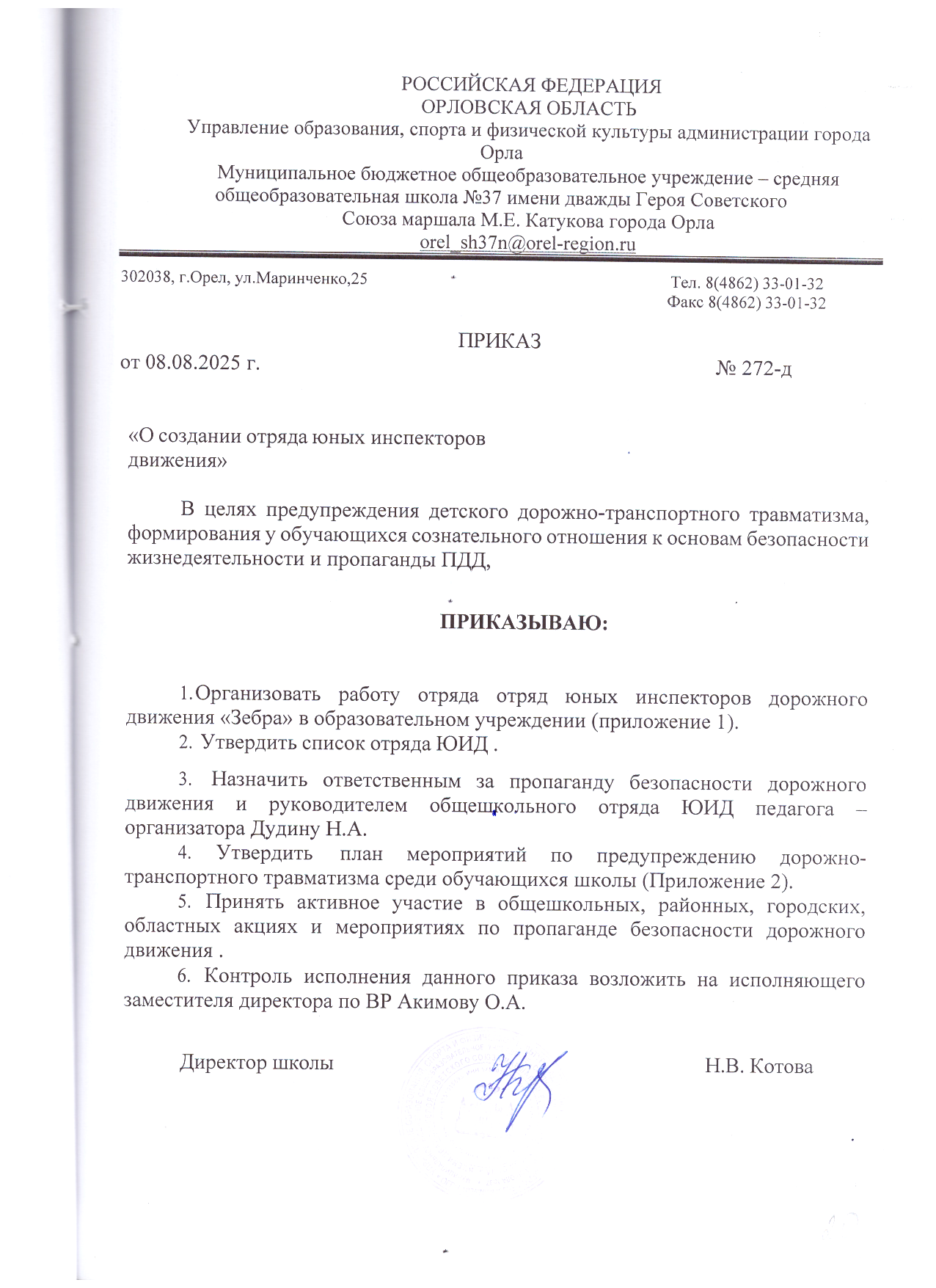 Приказ 272-д от 08.08.2025 "О создании отряда юных инспекторов движения"